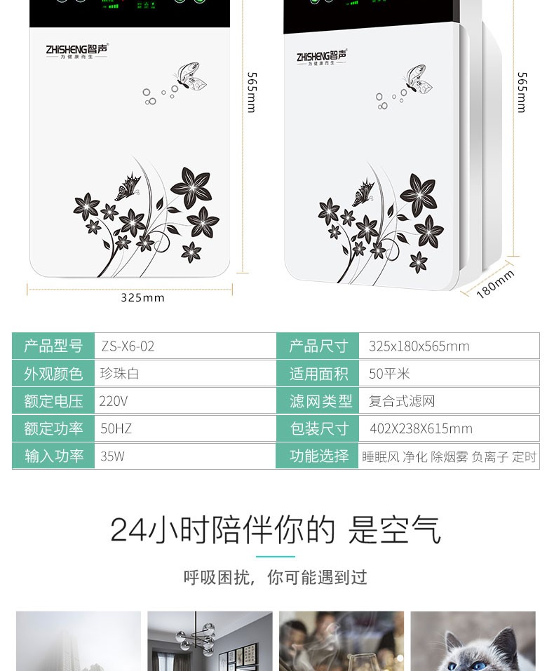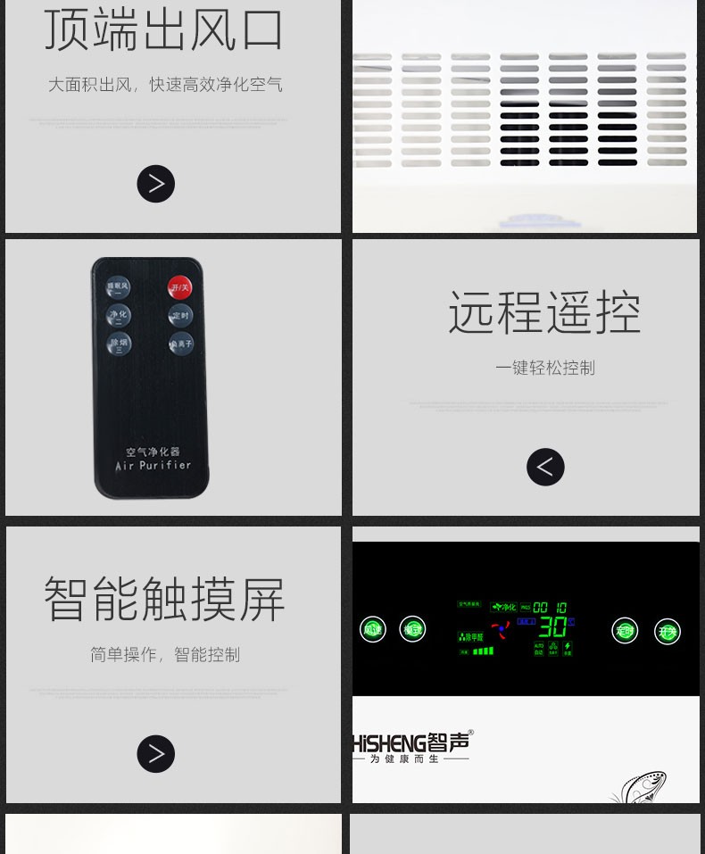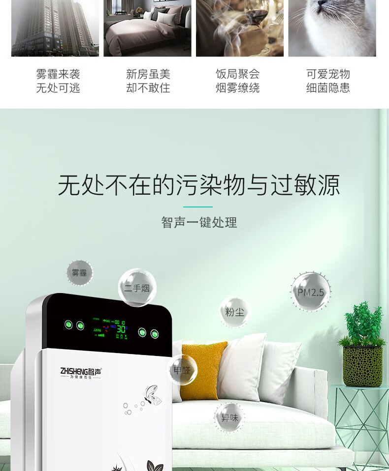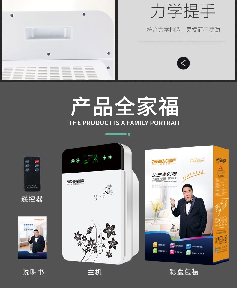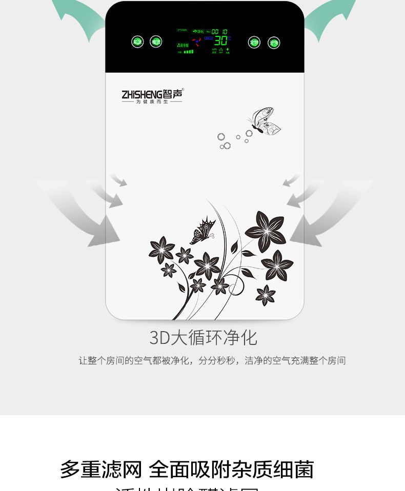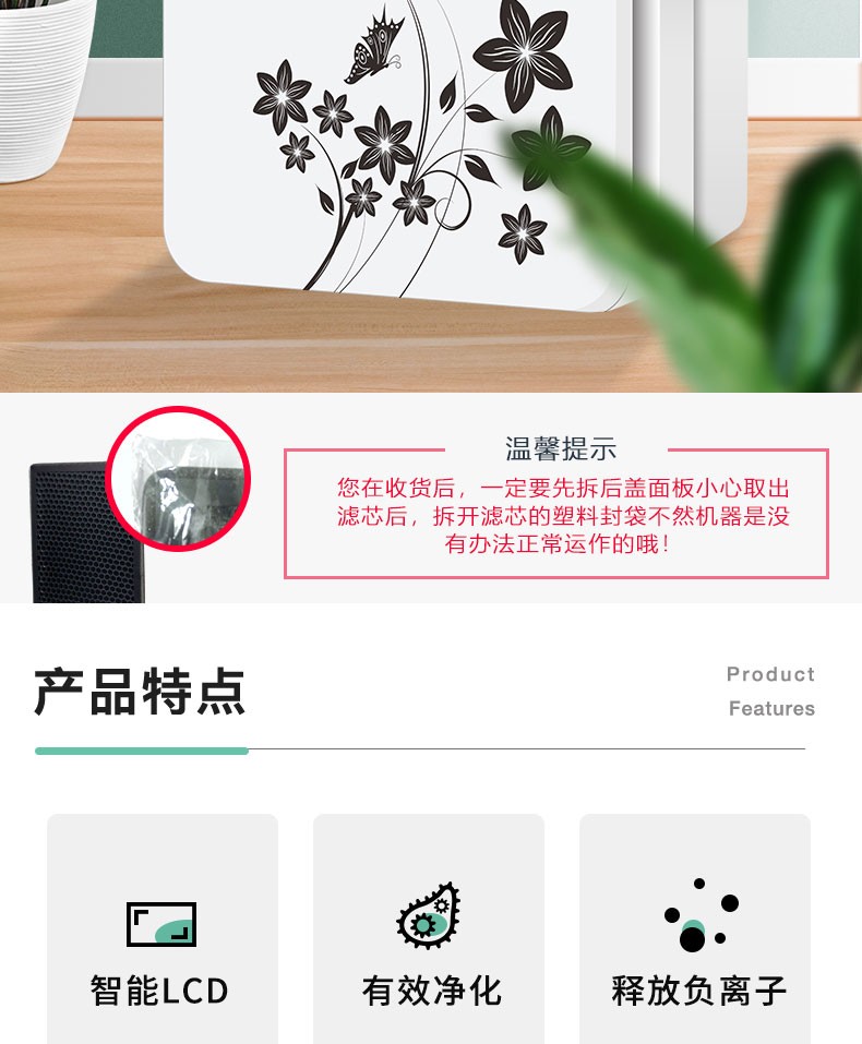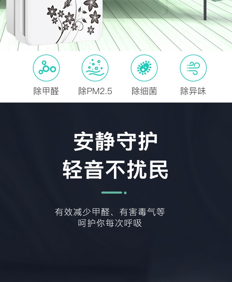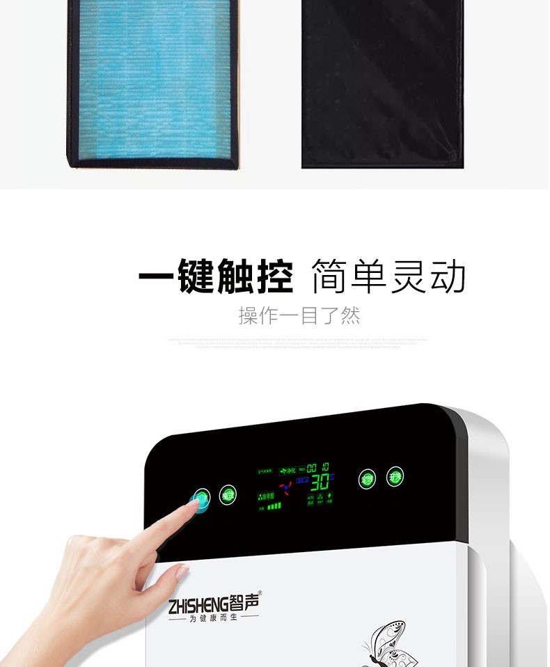 LED实时监测,pm2.5数值显示,高效复合HEPA滤网 负离子发生器,远程智能遥控 有效过滤灰尘,雾霾,甲醛,二手烟,PM2.5,让空气更清新 过滤工艺:HEPA技术