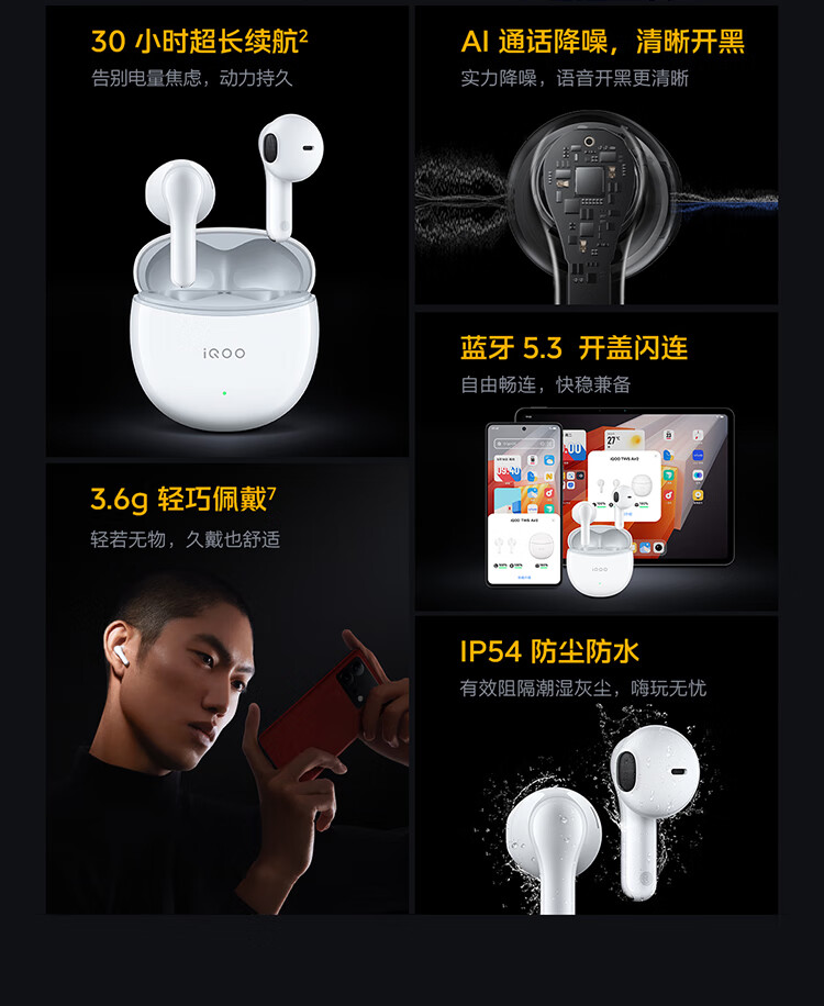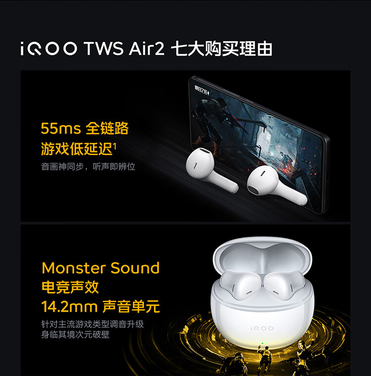 vivo iQOO TWS Air2 极焰黄 55ms超低游戏延迟 电竞声效 超轻佩戴 30小时超长续航 iqootwsair2